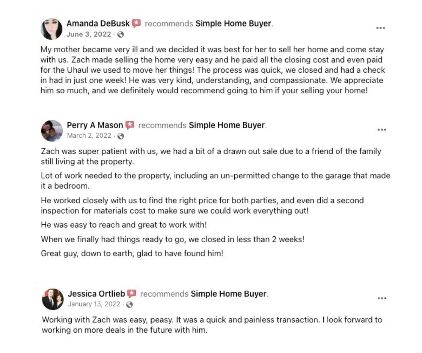 EXCELLENT Based on 91 reviews Posted on Heather WilliamsTrustindex verifies that the original source of the review is Google. My brother sister and I inherited our Mother’s house in Dayton,OH and weren’t in a position to keep it. I met with Zach and he walked me through the process. He communicated every step of the way and made us a fair cash offer on the property. I highly recommend reaching out to Zach if you find yourself in the same situation.Posted on Jack WourmsTrustindex verifies that the original source of the review is Google. Zach and his team at SHB is fantastic! We were able to close and I got my cash in just a week. If you ever need to sell your house in the Dayton, OH area, Simple Home Buyer is the one to call. Highly recommend!!Posted on Kelsey MasseyTrustindex verifies that the original source of the review is Google. Zach was awesome! He helped me sell my house truly quick and painless. An absolute pleasure to work with, and I recommend him to everyone I know!Posted on Brad LewisTrustindex verifies that the original source of the review is Google. Zach was great to deal with! Selling a house in Huber Heights has never been so easy. Thank you for your help!Posted on Ryan ChristieTrustindex verifies that the original source of the review is Google. Man the Zachary was amazing and was fast with response and with money did not waste time to come look and finalize with my home would definitely recommend and use againPosted on Kim FogleTrustindex verifies that the original source of the review is Google. Selling this family home was an incredibly emotional process but Zach made everything so much easier. He even met with my 87 and 84 year old parents and they fell in love with him! He was professional and responsive all the way through. Thank you, Zach!Posted on Brian DownsTrustindex verifies that the original source of the review is Google. We were looking to sell our house quickly to move to our dream home. SHB was our first choice due to great reviews and its accreditation with the BBB. Working with Zach only solidified that we made the right choice. He is genuine and honest in his dealings, and he was able to make the sale happen on our timeline. We are so glad we decided on SHB!Posted on Pat HanniganTrustindex verifies that the original source of the review is Google. I am recovering from a stage IV kidney cancer. Praise God! However, from diagnosis to multiple surgeries, to going in and out of the hospital and therapies, it had not only landed me into disability but also crippled my family financially. We had to decide to sell our house. The challenge was that we had an old house and it needed a lot of work. My wife had seen ads about companies buying houses "as is" and found a few companies locally. One of them was Simple Home Buyer. We reached out to them and Zach had responded to our call immediately. He made us an offer and scheduled to see the house. We signed a contract and had a tentative closing date. The whole process went fast and smooth until we hit a road block. The title clearance came back and there were liens attached to our property. We got discouraged and our hopes were down because this could prevent us from selling the place. Then we learned that Zach and his partners were still willing to work with our situation. They even went above and beyond to find a solution to continue the process. We initially contacted them on November 2, 2024 and that was a Saturday. We closed yesterday, a day before Thanksgiving, November 27. After everything they had done for us to close the sale, we not only ended up with money in our pockets to help us with the move, but they even gave us a couple of weeks after the closing date to be able to finish packing. Thank you, Zach and everybody! You guys are angels sent from heaven to help us land back on our feet and be able to start all over again after beating cancer. May God bless you more so that you may be able to be a blessing to more people!Posted on Kathy LynnTrustindex verifies that the original source of the review is Google. It was such a pleasure working with Zach! He was very helpful and understanding. Zach made this transition very comfortable and easy ! Will definitely work with him again.Posted on Brian SatterfieldTrustindex verifies that the original source of the review is Google. Zach was a pleasure to work with, sold my home fast and hassle free. Would recommend SHB to anyone!!!